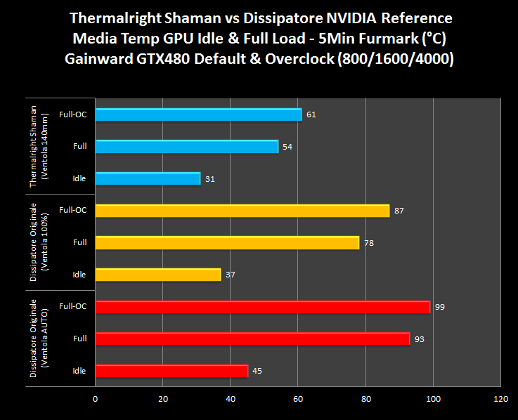 Come vediamo dal grafico riassuntivo, lo Shaman si dimostra senza ombra di dubbio una soluzione altamente performante. Le temperature registrate, con l’ausilio della ventola in dotazione, sono nettamente inferiori a quelle ottenibili con il dissipatore reference previsto da NVIDIA sulla sua GTX480. Oltre a questo non va trascurato l’aspetto legato alla “rumorosità”, la ventola in dotazione, anche a regime di rotazione massimo, è veramente molto silenziosa, contrariamente alla soluzione reference NVIDIA, che il più delle volte raggiunge livelli estremamente fastidiosi, già in condizioni d’uso normali.