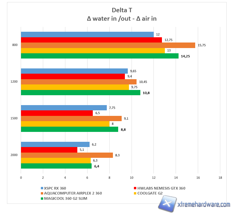 A 800 RPM mostra come il suo cuore radiante di soli 27mm di spessore unito a un FPI alto sono un limite strutturale a cui non si può porre rimedio, per questo motivo il delta accusato è consistente, anche se fa registrare 1,5°C in meno rispetto al suo concorrente diretto (per caratteristiche e spessore), l’Aquacomputer Airplex Radical 2 360. Quest’ultimo recupera invece terreno sui 1200 RPM e in questo caso il Magicool si dimostra (seppur con differenze risicate) il fanalino di coda della classifica.