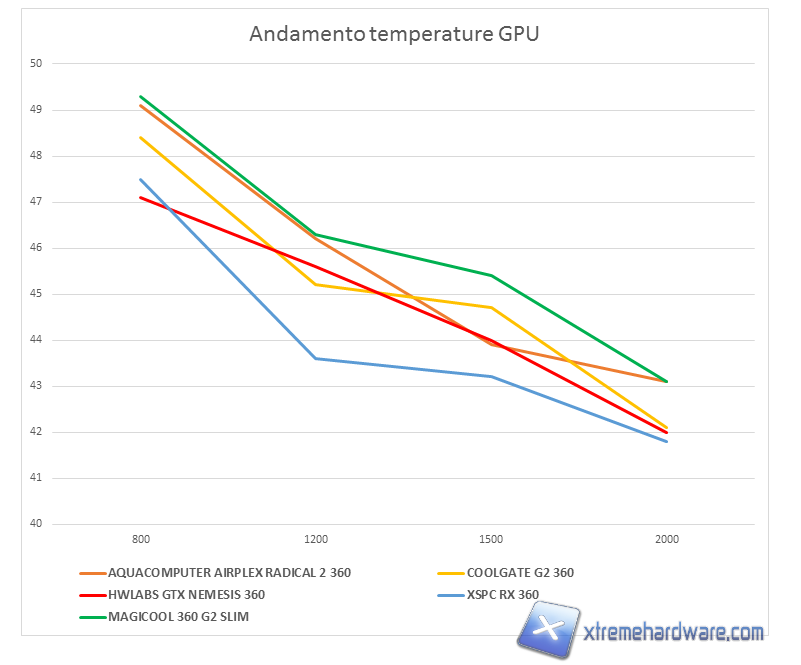 Sulla nostra Nvidia GTX 980 (che è sicuramente il componente più utilizzato durante il benchmark) invece le temperature rilevate sono le più alte e in linea con quelle fatte registrare dal radiatore Aquacomputer Airplex Radical 2 360 che ricordiamo, è il suo concorrente più diretto e inoltre mostra un netto miglioramento delle prestazioni all’aumentare degli RPM delle ventole.