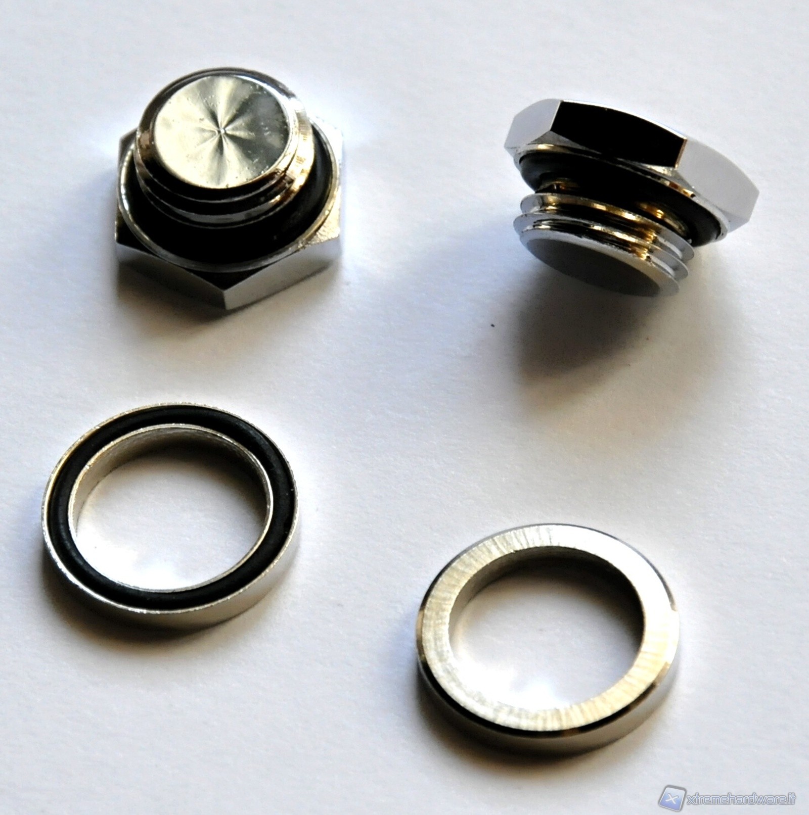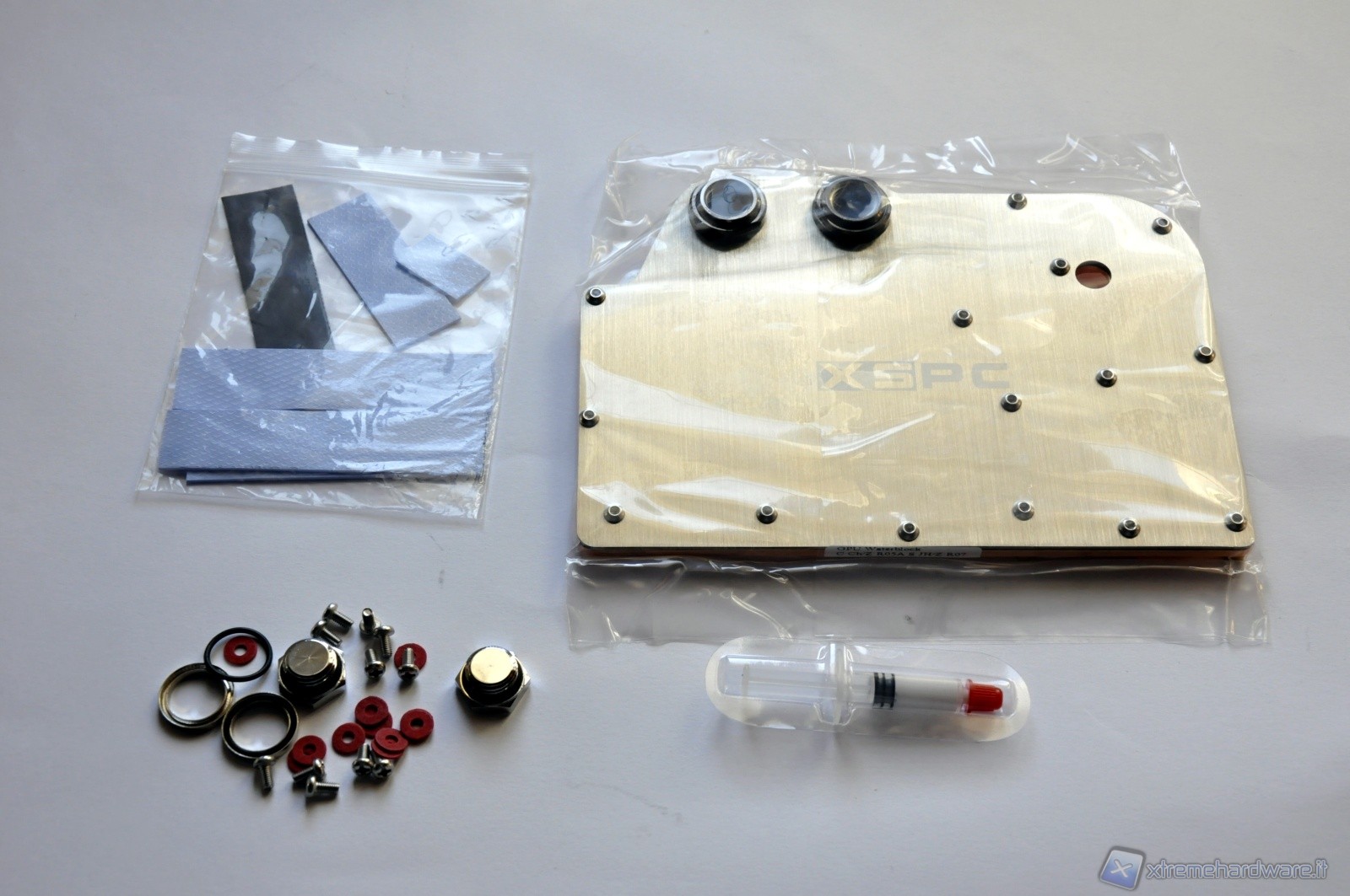 Accompagna il prodotto anche la classica viteria che consta di 2 tappi e rondelle distanziatrici provvisti entrambi di guarnizione O-ring oltre che di viti e rondelle per il fissaggio del waterblock al PCB della scheda video. Per finire abbiamo una siringa di pasta termica da spalmare sulla GPU ed i pad termici che vanno a coprire i chip di memoria e di alimentazione, anch’essi da raffreddare.