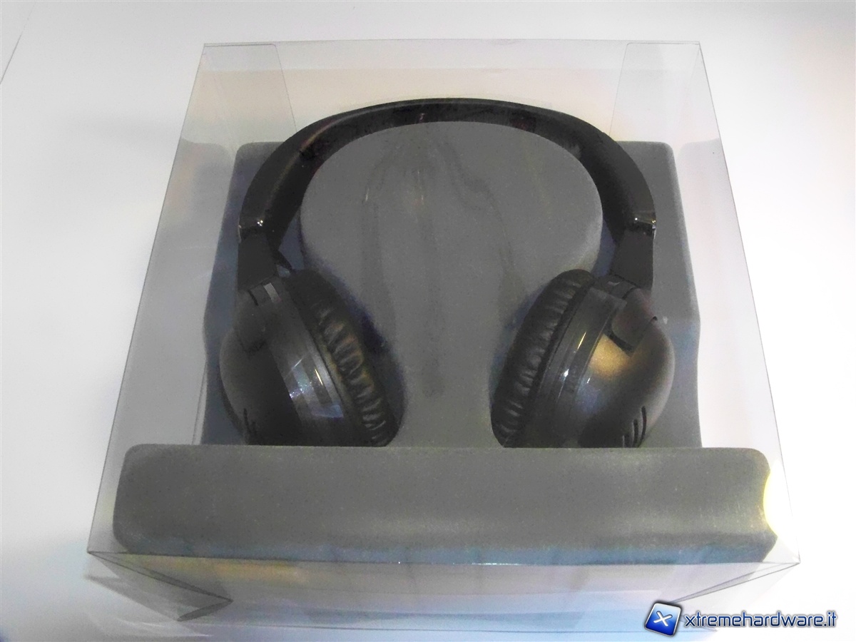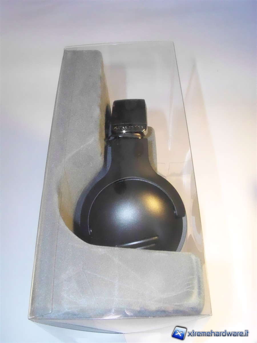 Sulla parte frontale possiamo trovare, oltre al nome del prodotto, le features che lo caratterizzano ed una parte trasparente che permette di dare un primo sguardo all’headset, dando la possibilità all’utente di valutarne il prodotto.