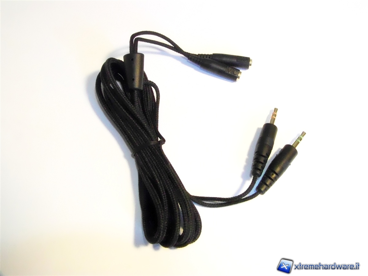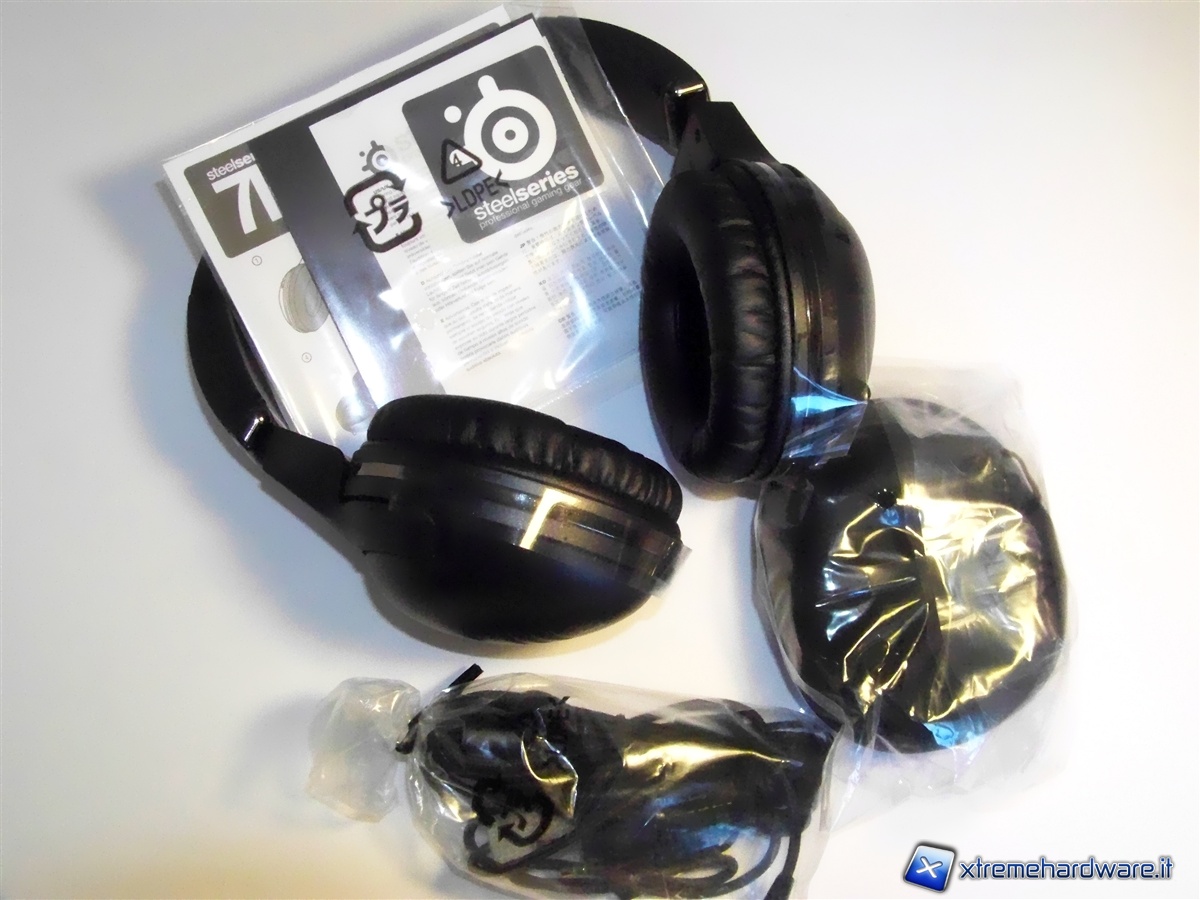 Una volta aperta anche questa copertura ci troviamo di fronte all'headset, ai cavi di collegamento con tanto di prolunga, ad un paio di cuscinetti auricolari di ricambio ed a due manuali utente.