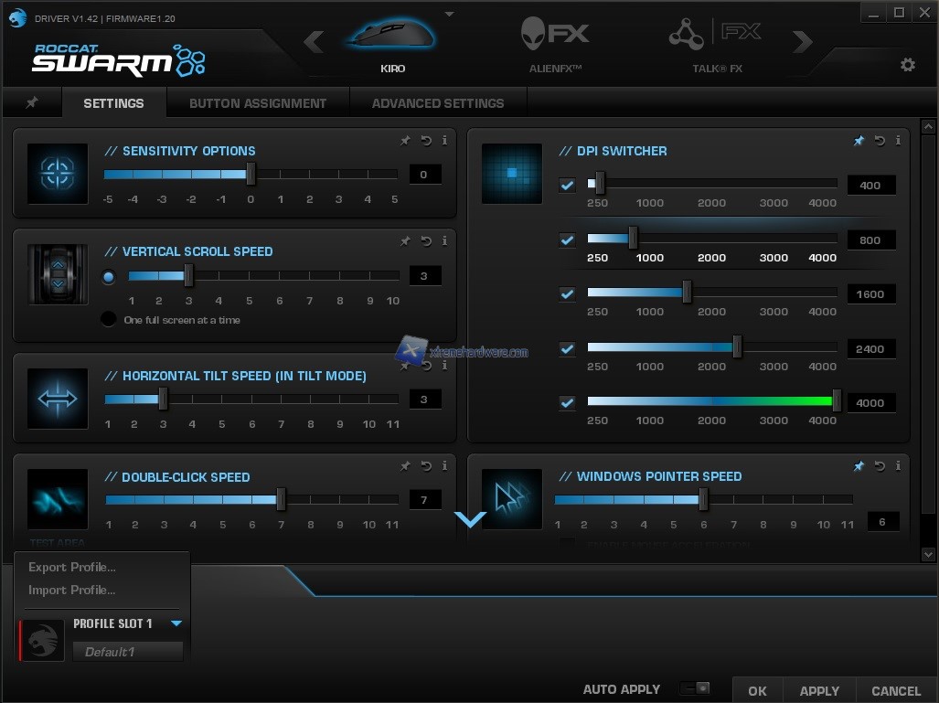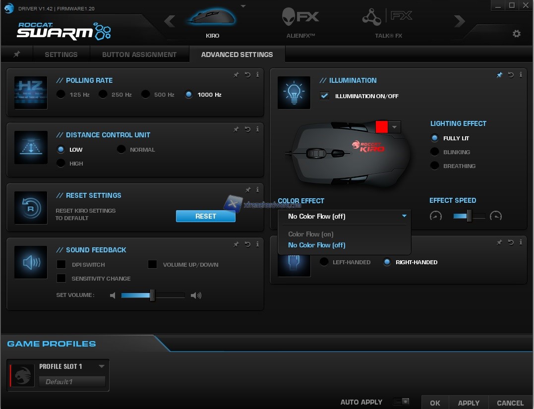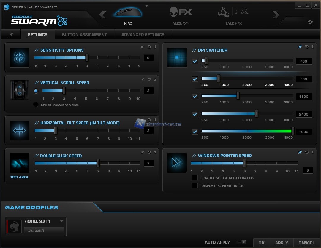 ROCCAT come visto anche in altre nostre recensioni mette a disposizione anche alcune funzioni avanzate quali ‘’AlienFX’’ che ci darà modo di creare un sistema unico di retroilluminazione con i PC Desktop o Notebook Alienware. La compatibilità di tale funzione è al momento relegata tramite il software Swarm alle periferiche che abbiamo citato prima.
