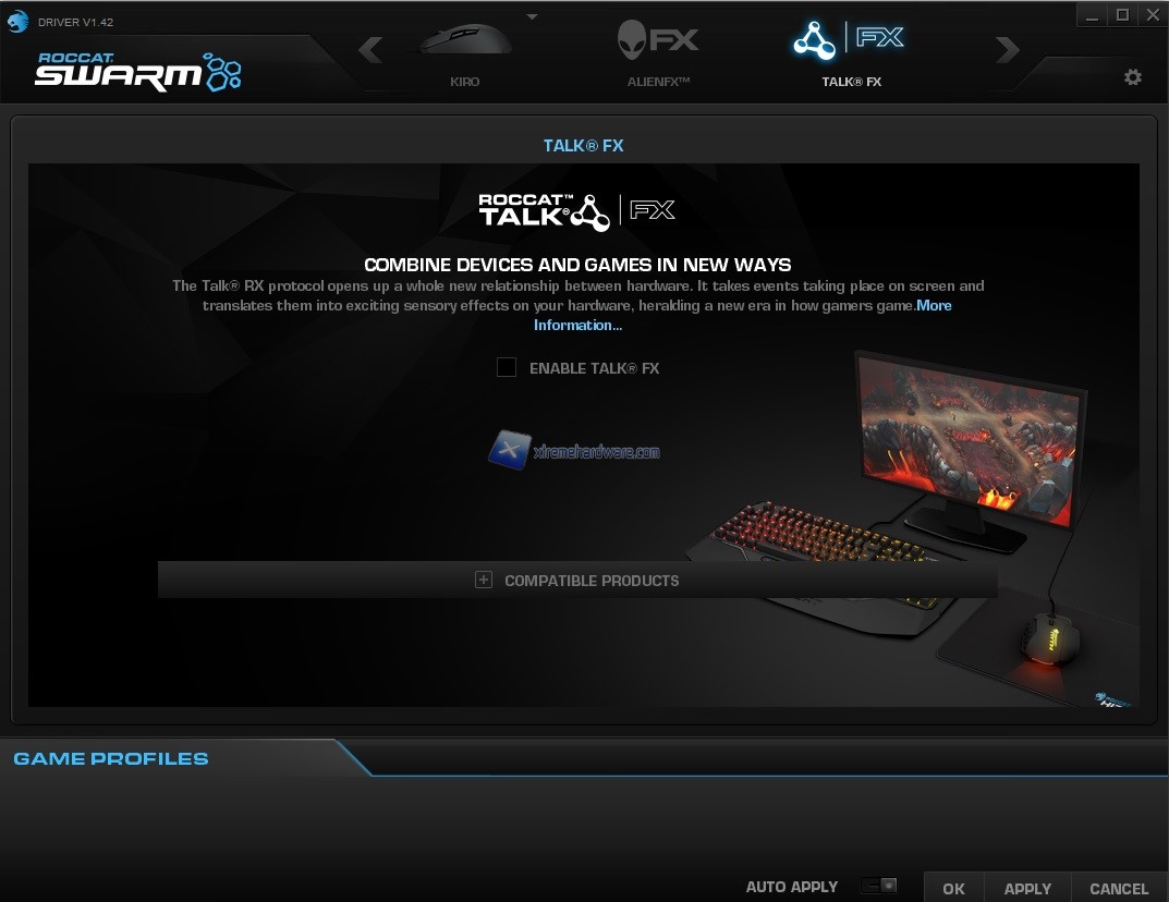 Da progetto nascente a funzione funzionante a tutti gli effetti ecco anche la funzione ‘’TalkFX’’ di ROCCAT che ci darà modo di mettere in comunicazioni scene di gioco con effetti visivi di retroilluminazione delle periferiche compatibili. Potremo ‘’legare’’ un gioco in modo che ad ogni esplosione, effetto la retroilluminazione del mouse e della tastiera risponda allo stesso modo e tempo