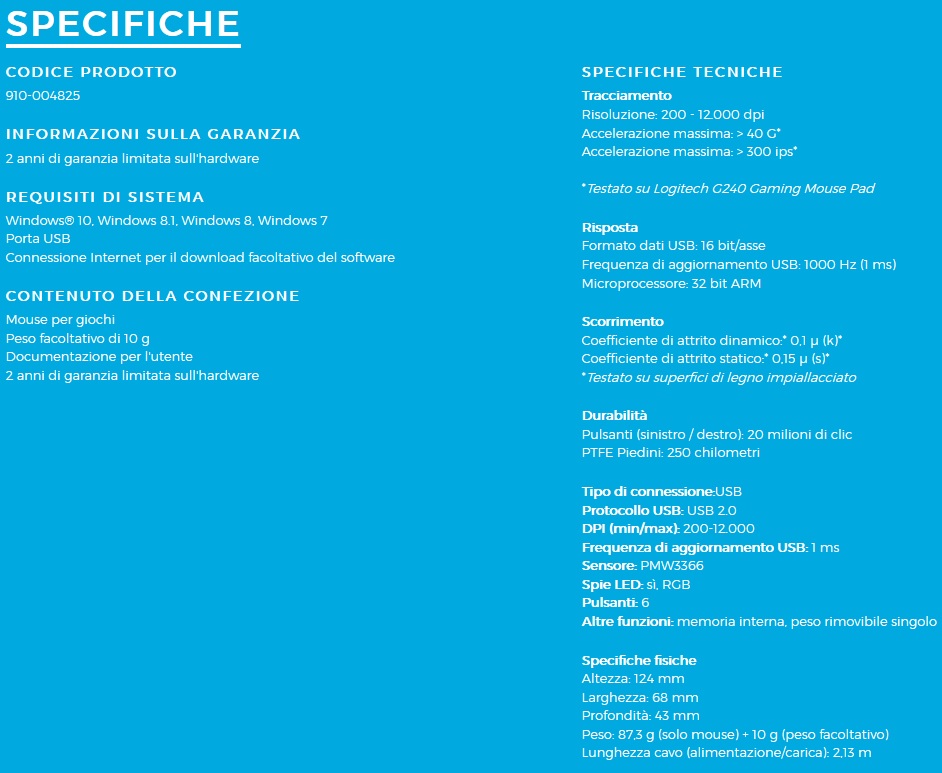 Procediamo ad elencare brevemente le caratteristiche del mouse Logitech G403 Prodigy: