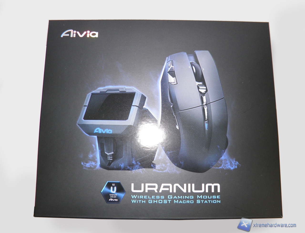 La confezione del Gigabyte Uranium è davvero gigantesca, potrebbe facilmente competere dimensionalmente parlando con quella di un alimentatore di buona fattura. Nella parte superiore della confezione troviamo l'immagine del mouse e della dock, oltre al nome del prodotto e alcune informazioni di natura tecnica.
