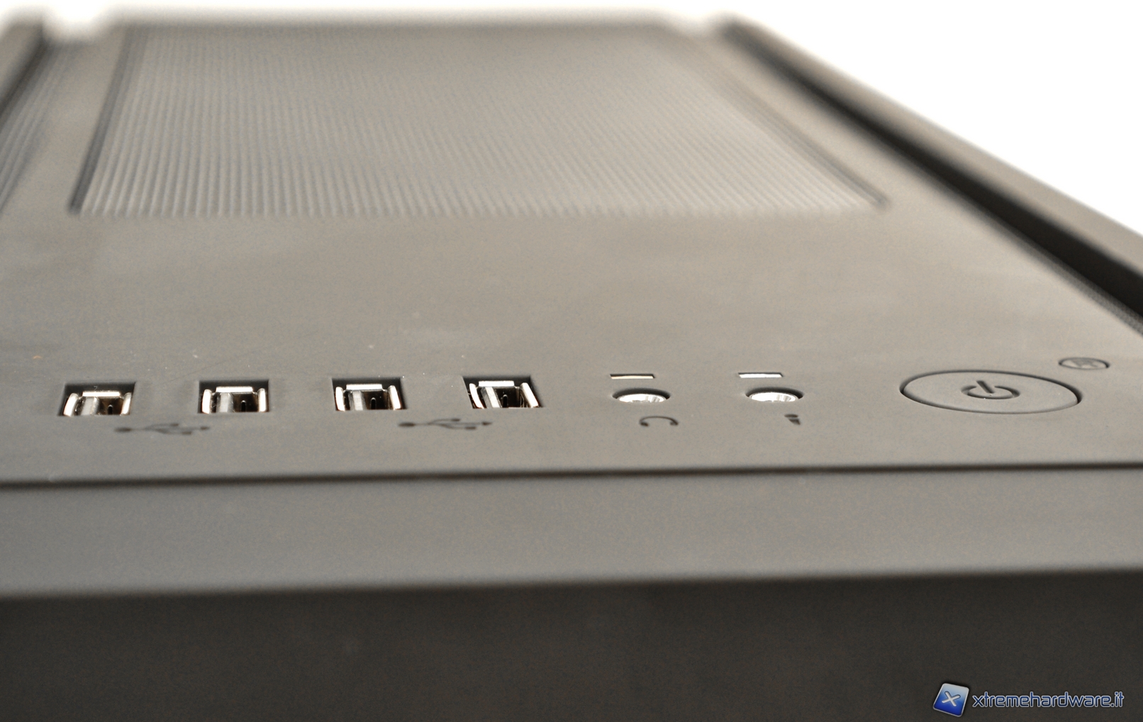 Sul tetto, partendo da sinistra verso destro, troviamo ben 4 porte USB 2.0,attacco per le cuffie, per il microfono, tasto di accensione e di reset. Davvero utili le 4 porte USB 2.0 che sommate a quelle della scheda madre ci consentiranno di collegare tutti i dispositivi che vogliamo senza ricorrere ad adattatori aggiuntivi. Assenti purtroppo connessioni USB 3.0.