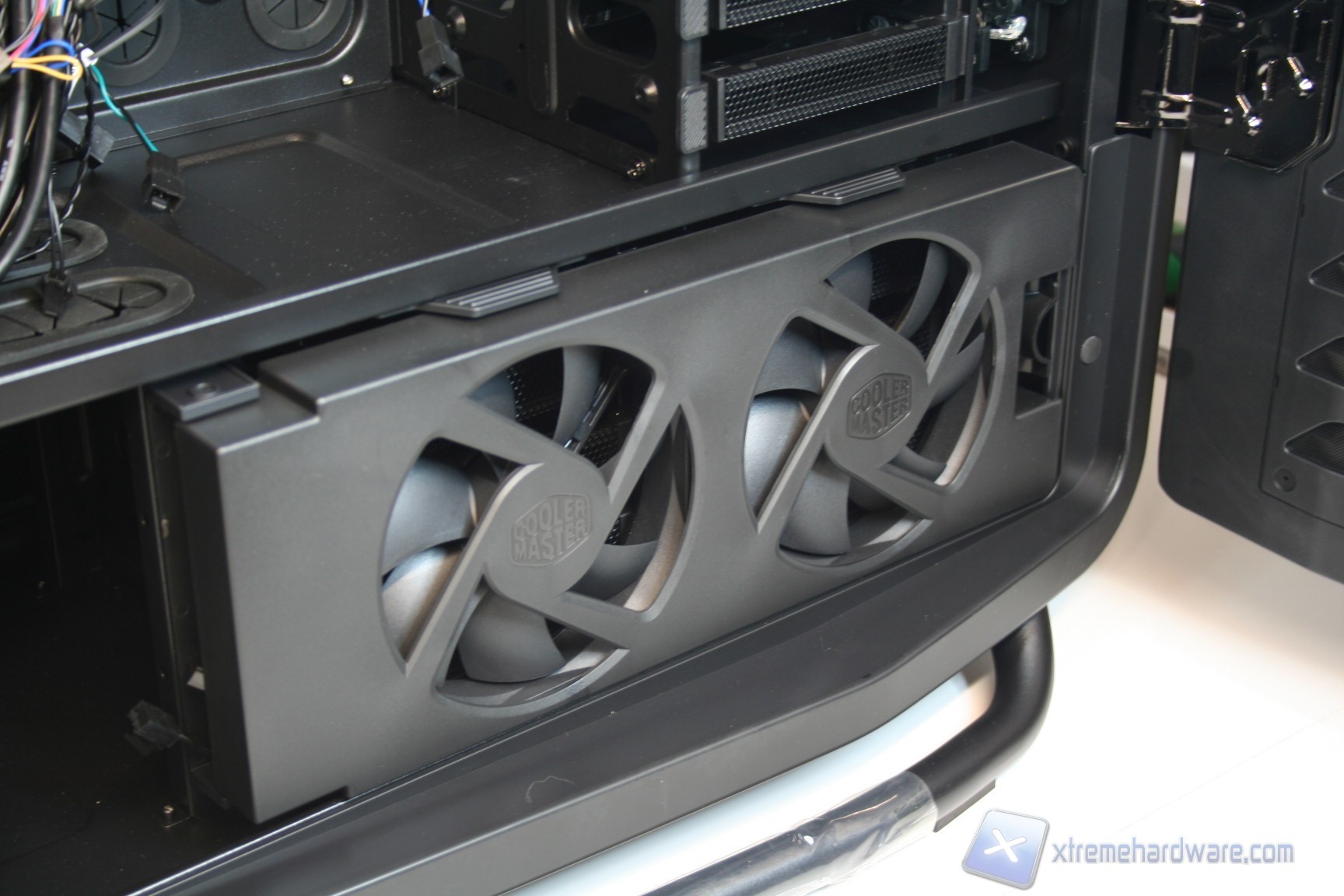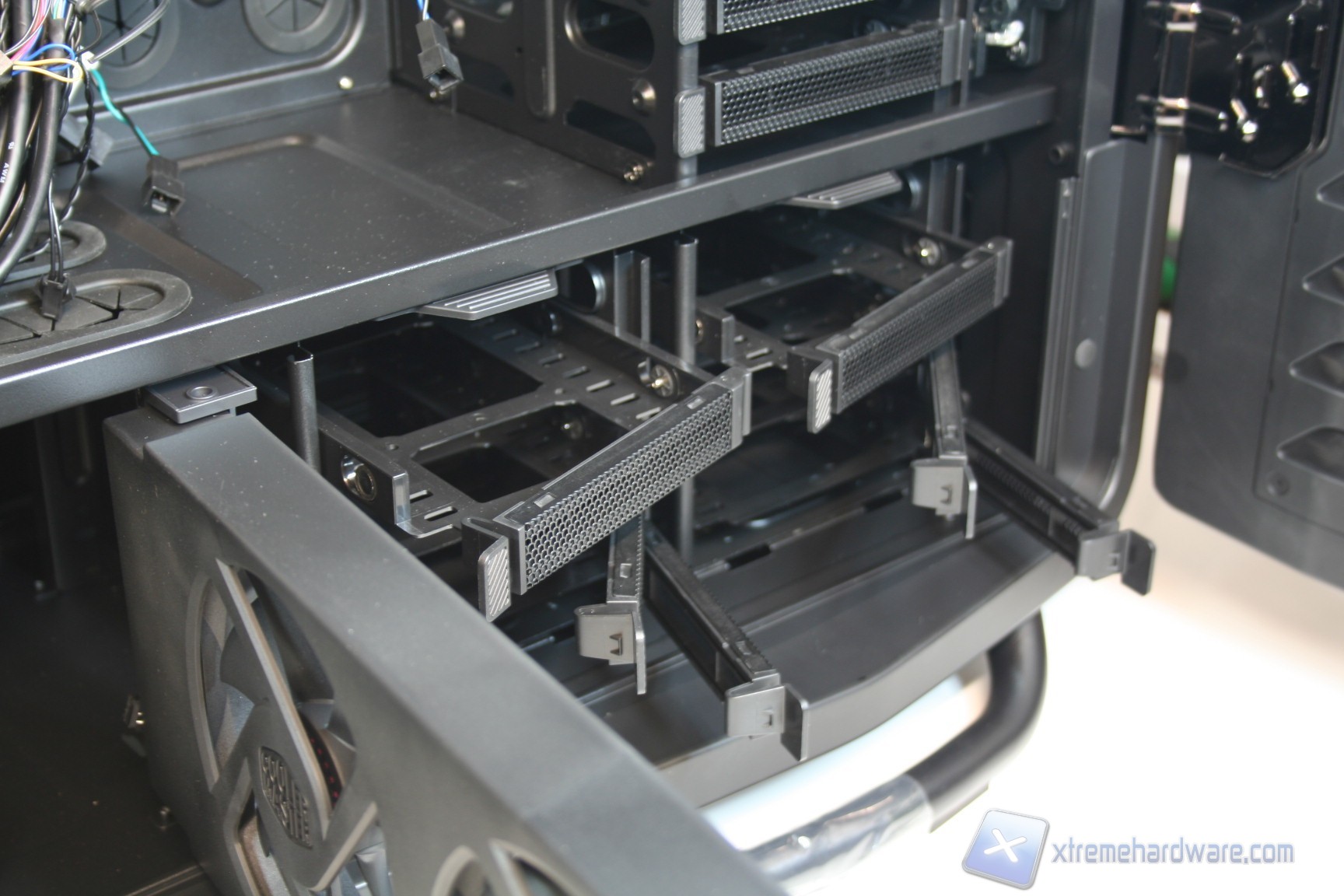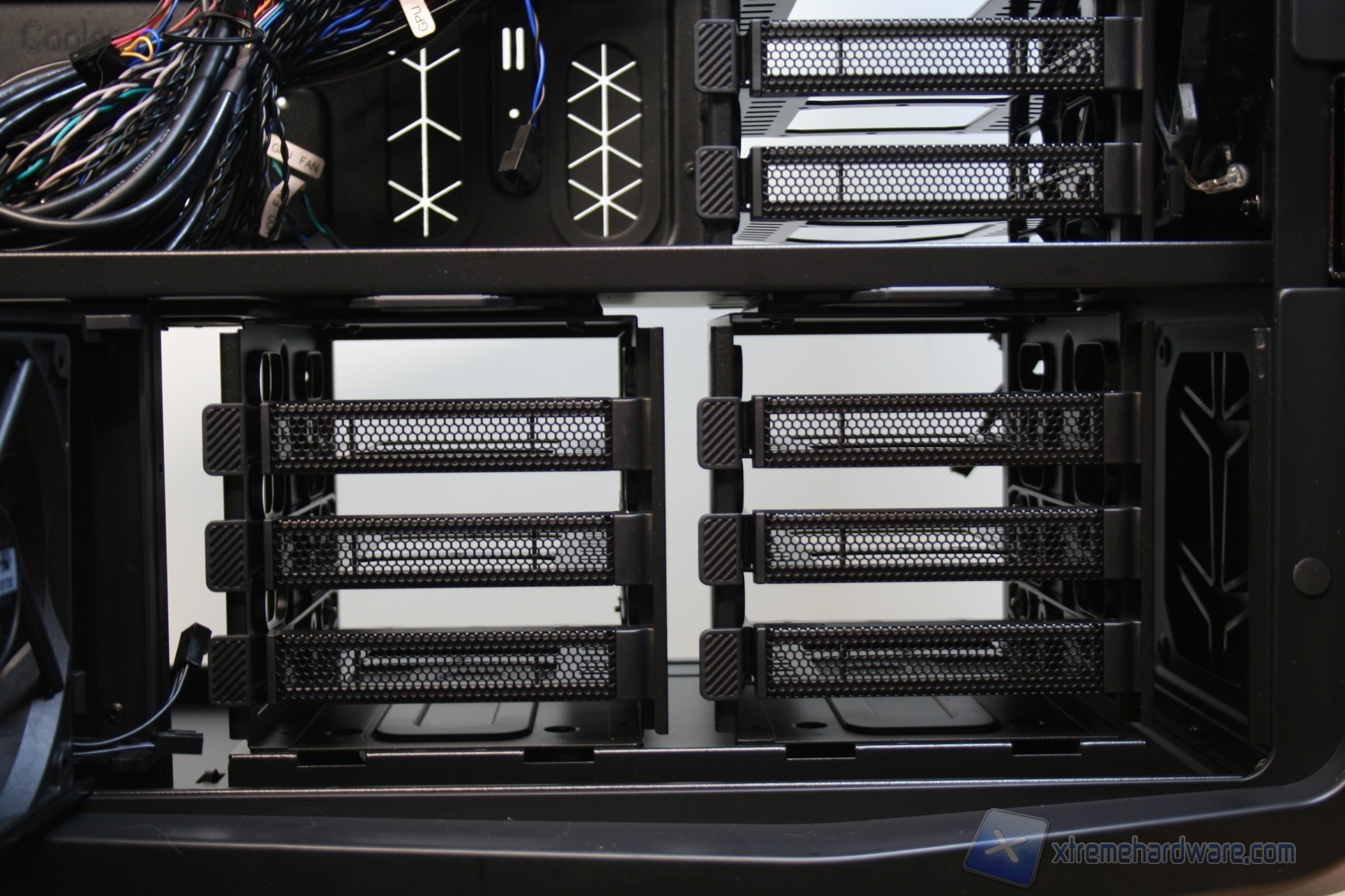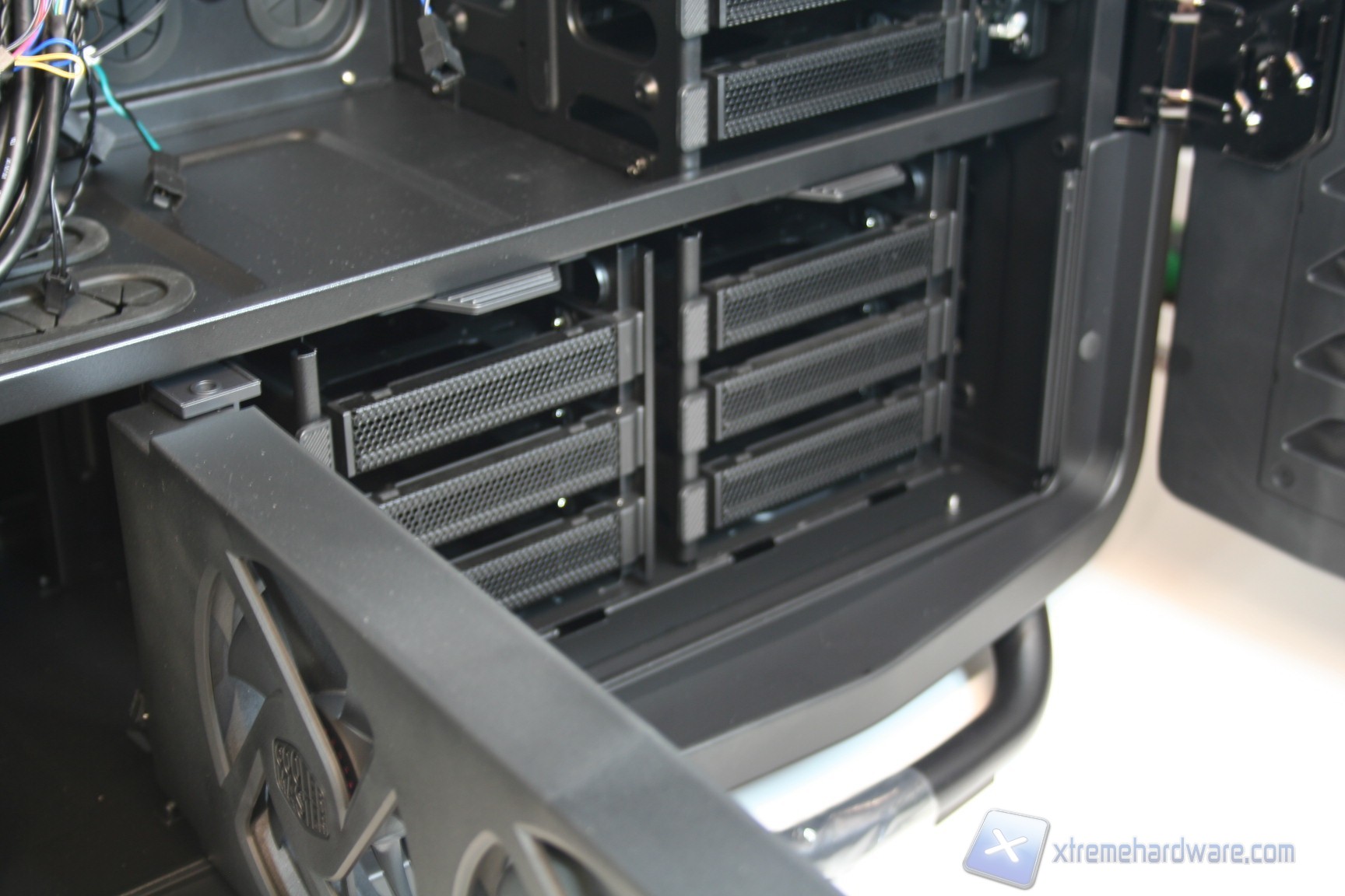 Nella parte inferiore invece sono stati installati due cage, removibili grazie a semplici viti di ancoraggio, che permettono l’installazione di altri 6 hard disk e che ne permettono la ventilazione grazie a due ventole da 120mm preinstallate, le quali vengono connesse direttamente al sistema di regolazione nel pannello superiore. Questo sistema permette la regolazione della ventilazione interna, e conseguentemente sia della rumorosità che delle temperature. Ovviamente questo supporto per le ventole può essere aperto grazie ad una levetta, tramite un movimento orizzontale di 90 gradi in senso orario, ma può anche essere rimosso qualora fosse inutile, o qualora dovesse servire uno spazio maggiore.