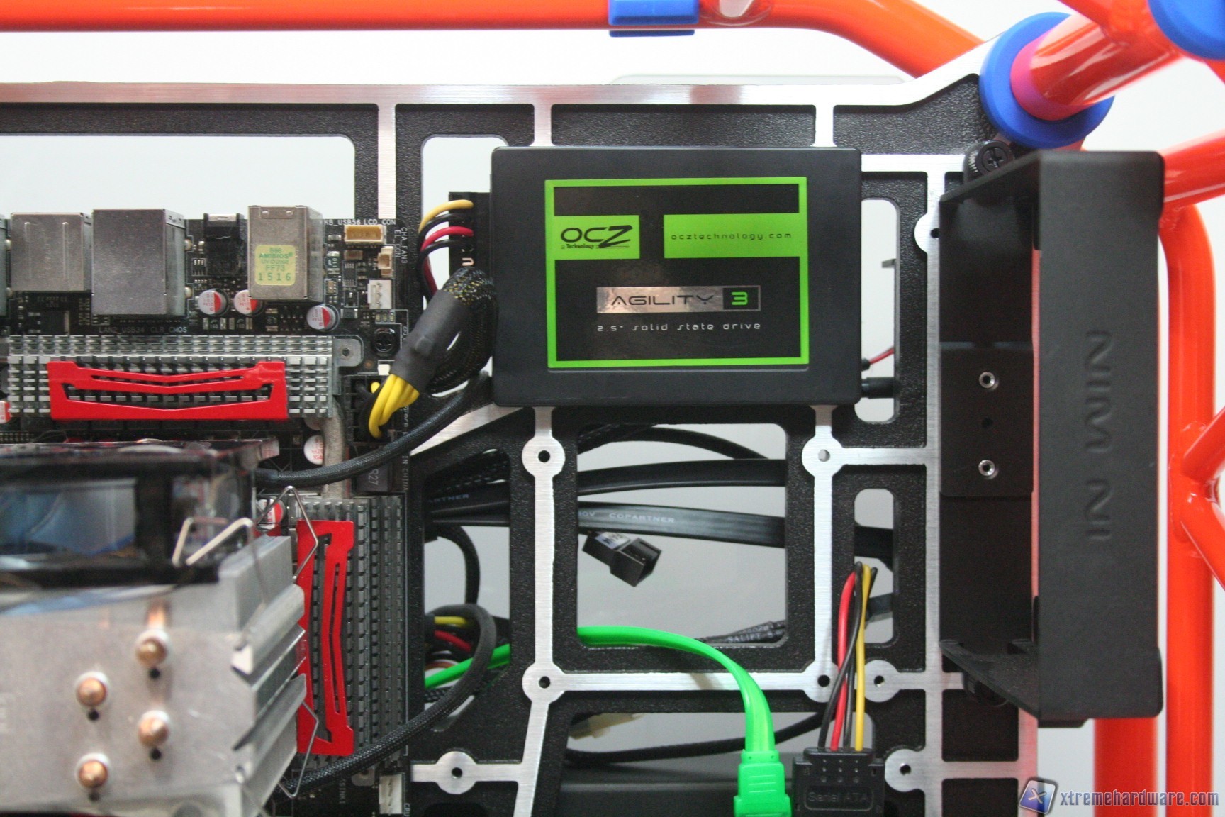 Ora analizzeremo velocemente il montaggio di un sistema Intel, ed il conseguente cablaggio posteriore ed anteriore. Anche per gli utenti poco esperti la procedura è molto facile: per prima cosa dovrete montare l’alimentatore al lato sinistro del cabinet, facendo attenzione a passare il connettore di alimentazione supplementare della scheda madre, da 4/8 pin direttamente dietro il plate della mobo, se il connettore non è molto lungo o se non siete in possesso di prolunghe di alimentazione. Date le dimensioni ridotte, difficilmente saranno necessarie delle prolunghe per il connettore della scheda madre 24 pin, anche se forse per quello da 4+4pin EPS 12V sarebbe opportuno utilizzane una (ne consigliamo sempre l’adozione). Fatto questo consigliamo l’installazione dei dischi rigidi ed anche già il cablaggio dei connettori di alimentazione e interconnessione, facendo attenzione a posizionarli in serie nei cage predisposti a scorrimento. Abbiamo avuto un problema con il posizionamento degli SSD in quanto c’è una bassissima tolleranza laterale tra lo slot di inserimento del connettore SATA dati ed alimentazione, quindi è consigliato l’utilizzo di cavi piatti: